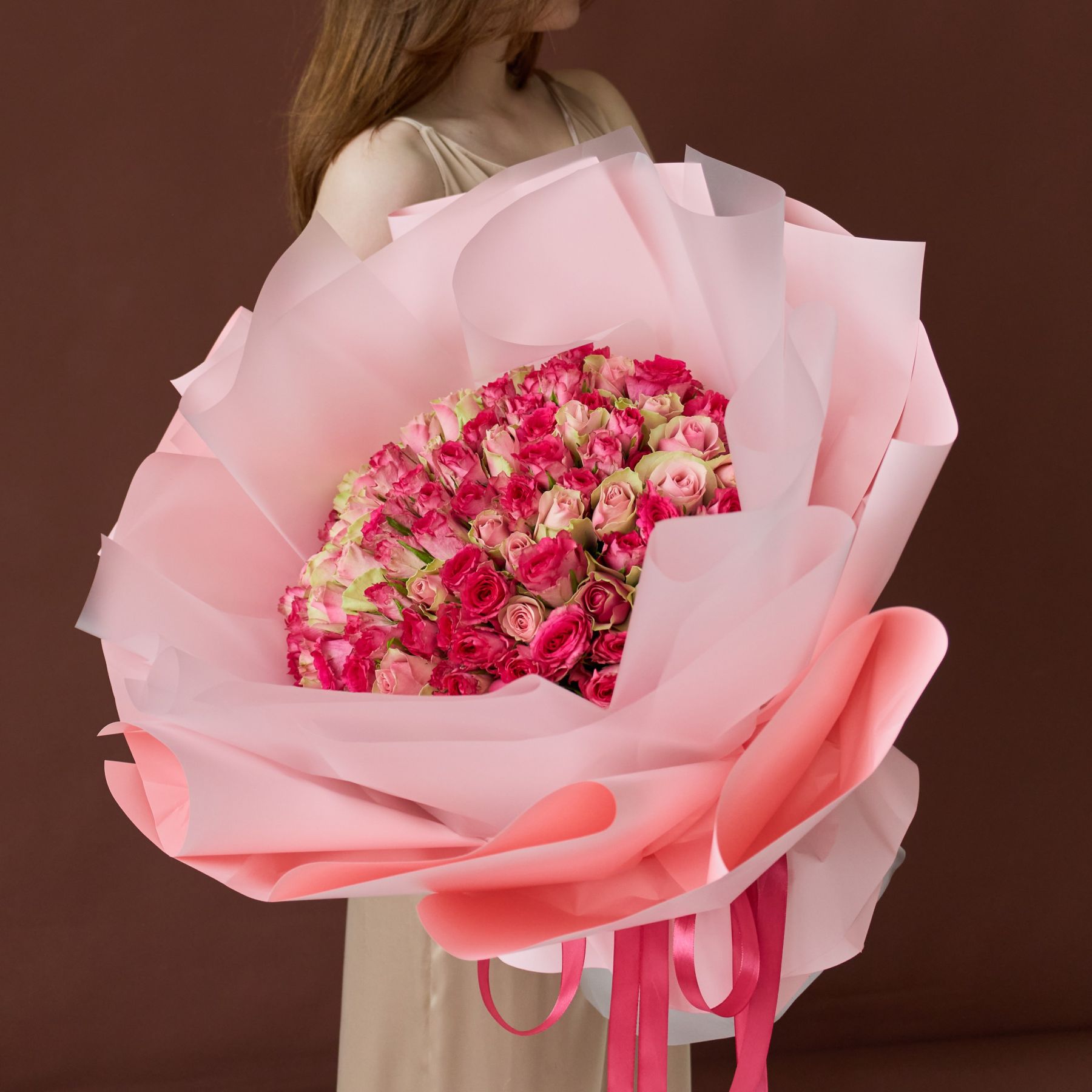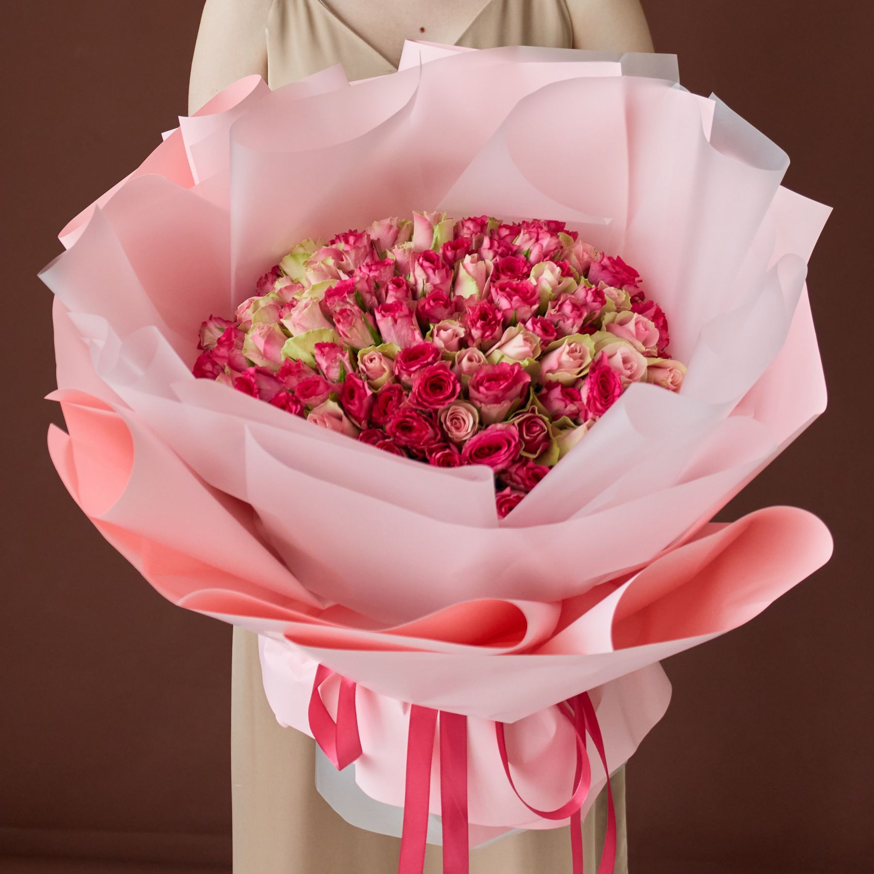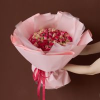 101 роза розовый микс в пышном оформлении (40см) Кения.