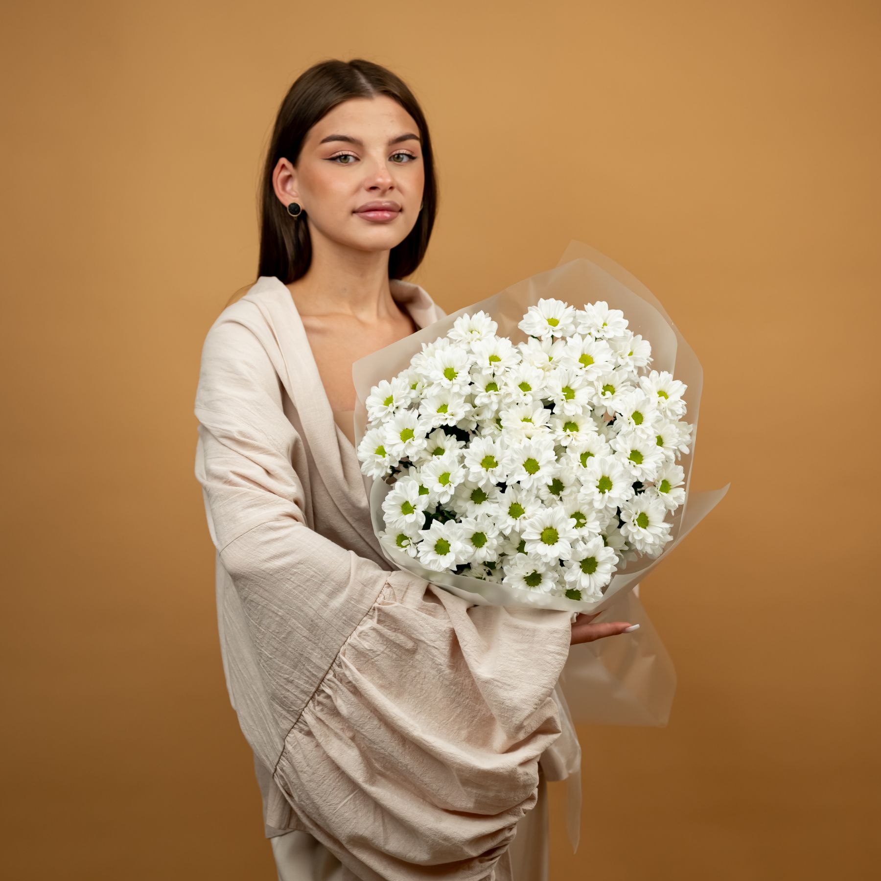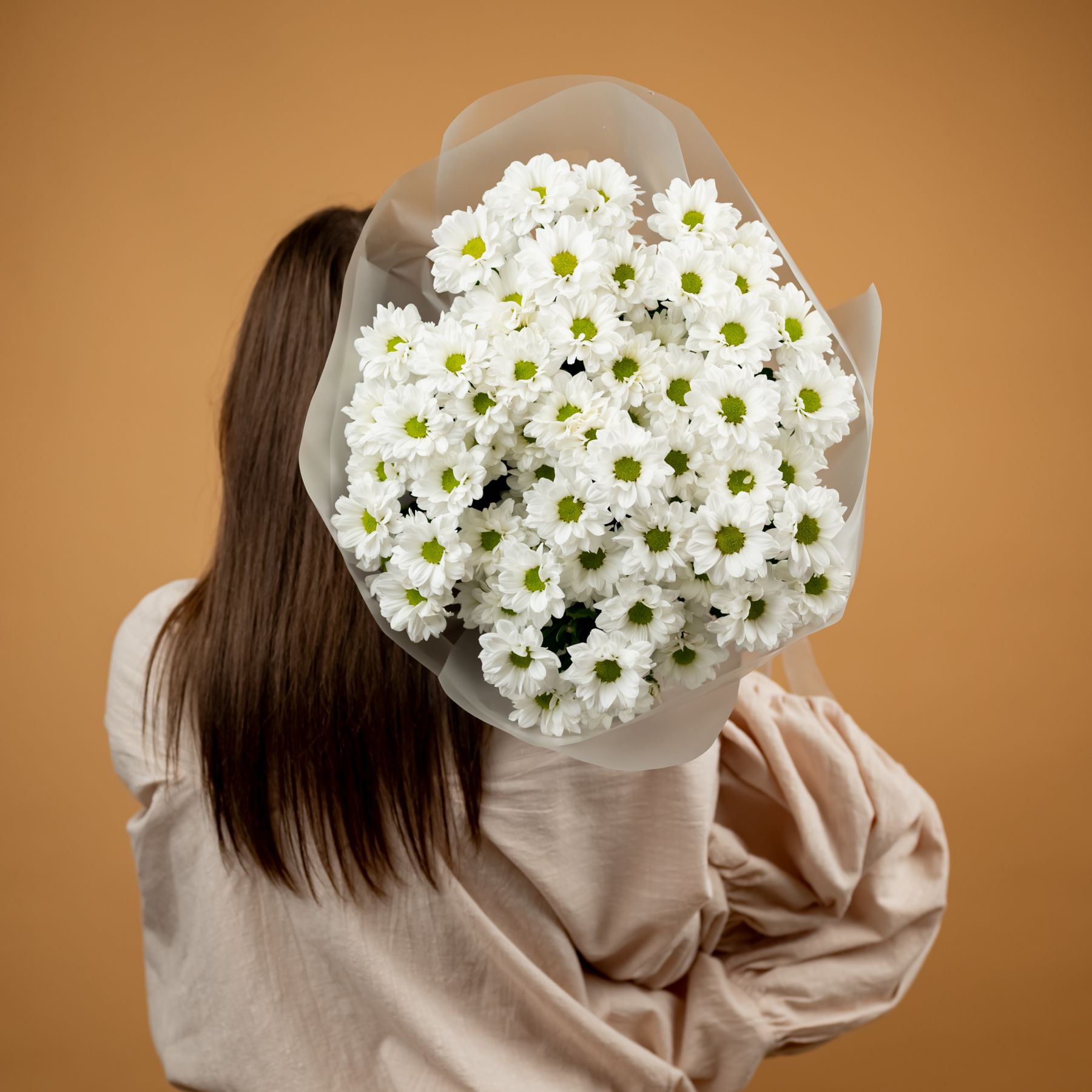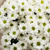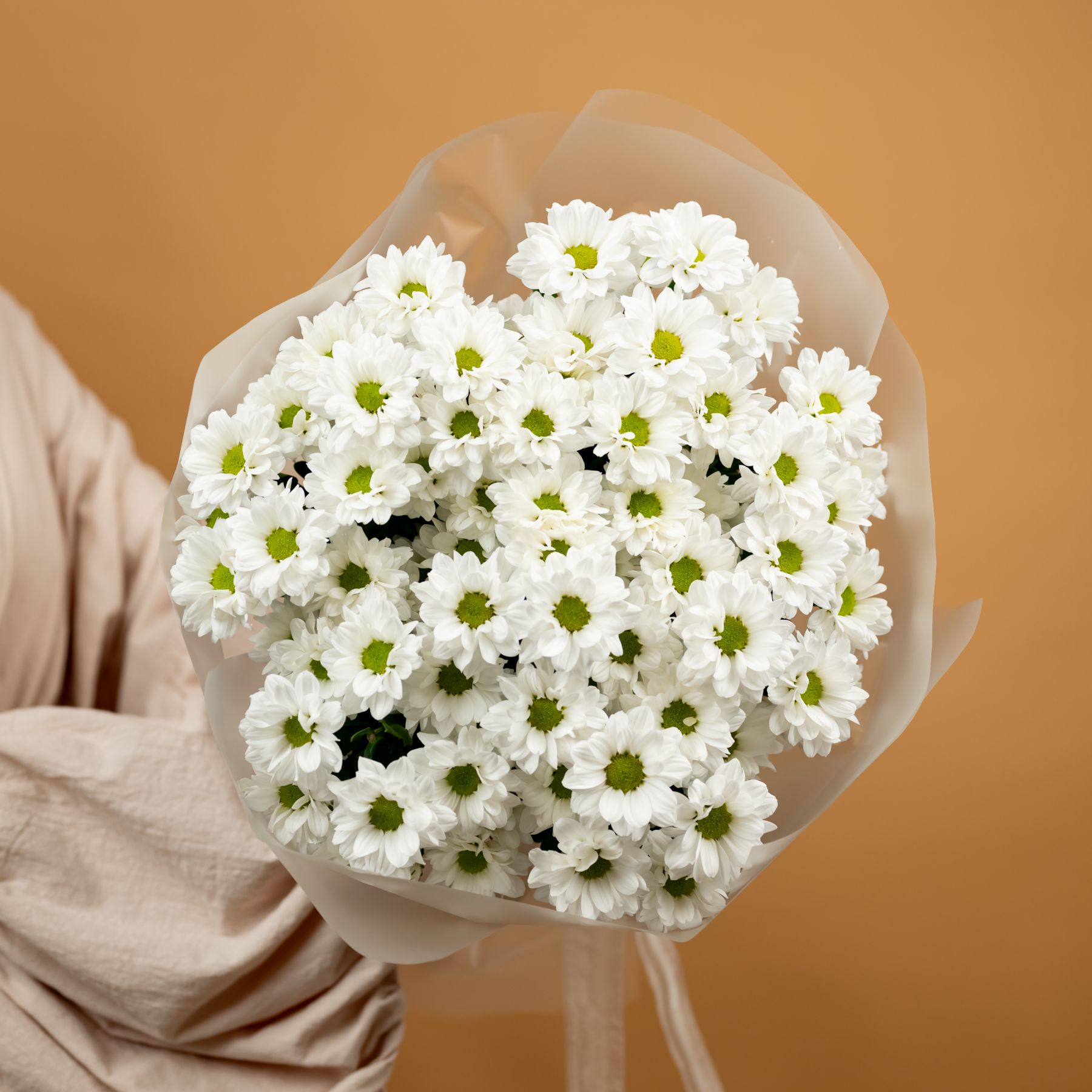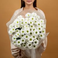Букет из стойких кустовых хризантем в красивом оформлении.