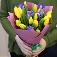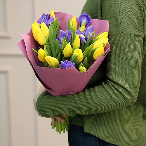 Букет из 15 желтых тюльпанов с ирисами 5шт в упаковке.