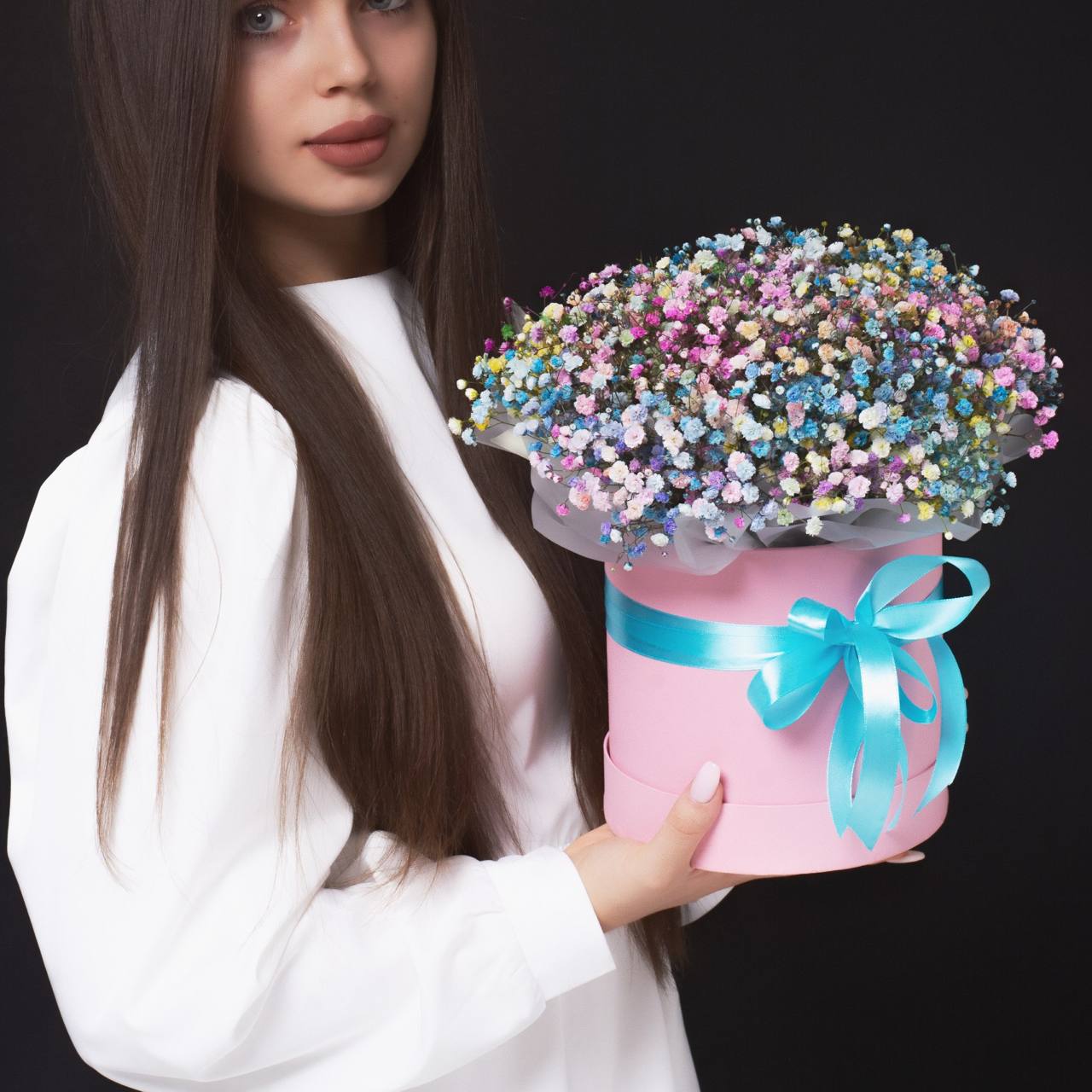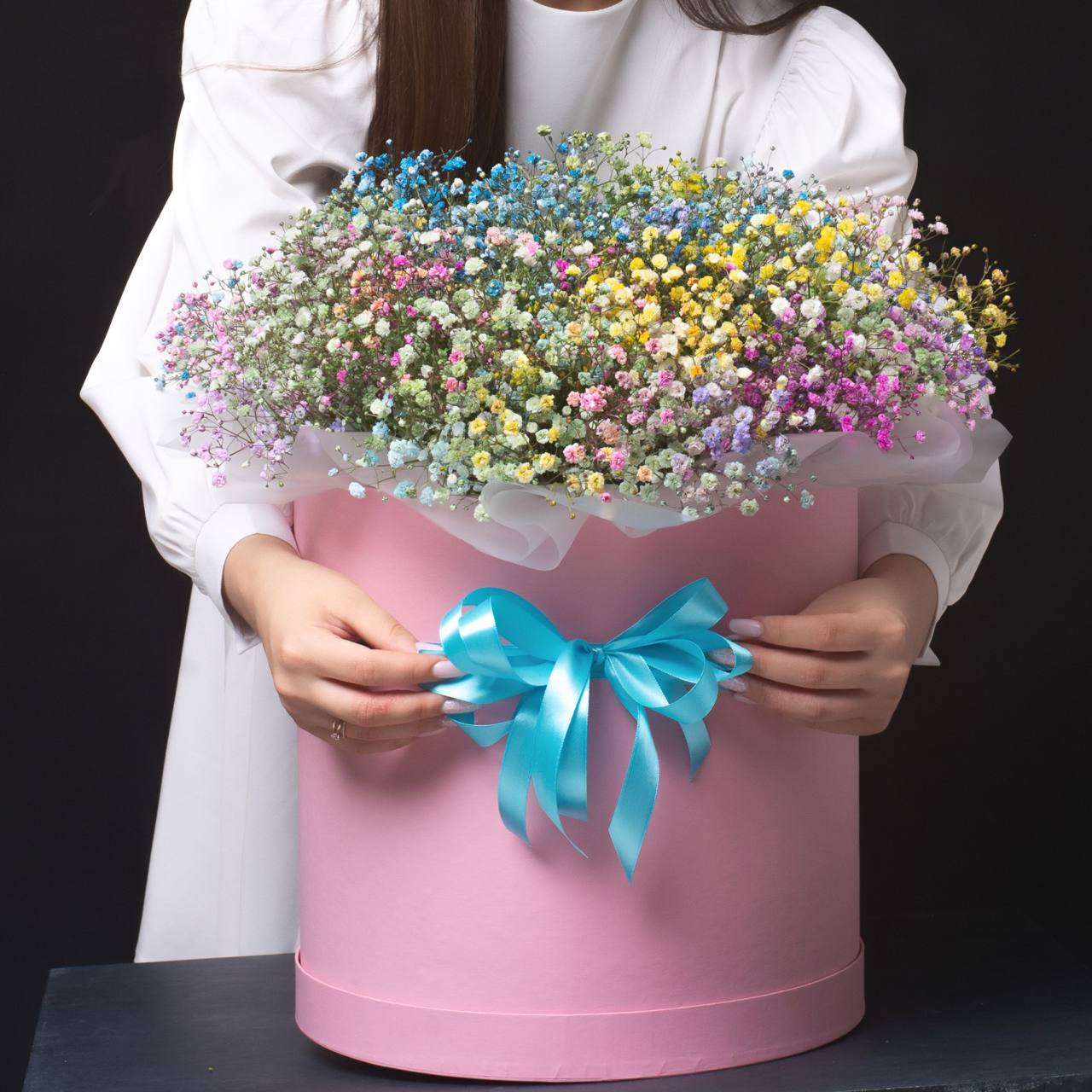 Цвет коробки и гипсофилы подбирается из наличия.