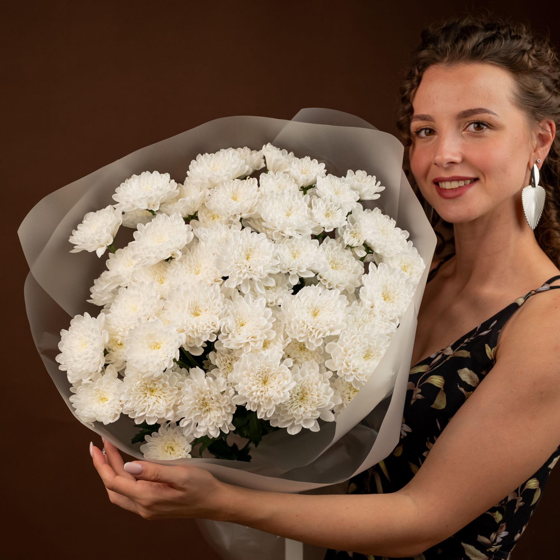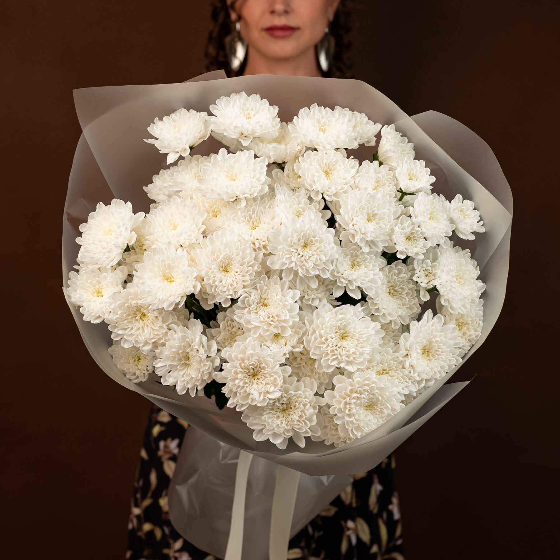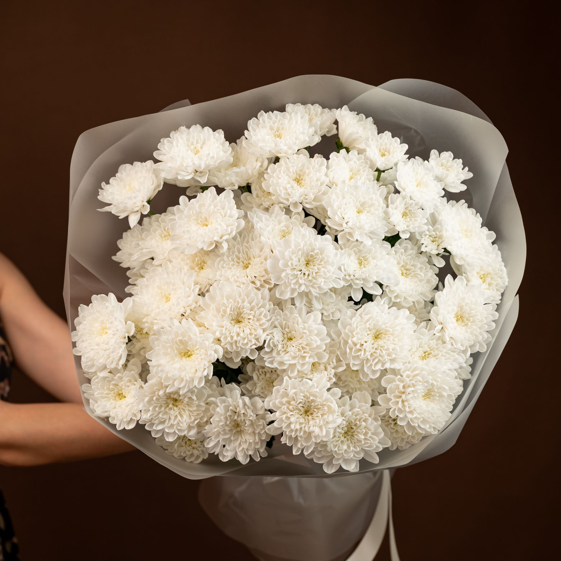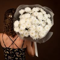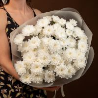 Букет из стойких кустовых хризантем в красивом оформлении.